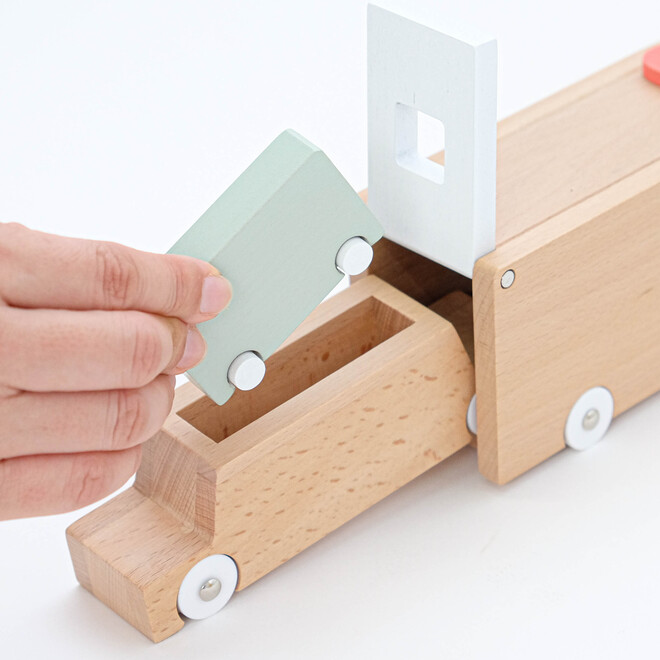 目安としては2歳〜のお子さまに適しています。車を動かしたり、中に入れたり出したりする動作が、手指の発達や順序・サイズの認識にもつながります。 |
