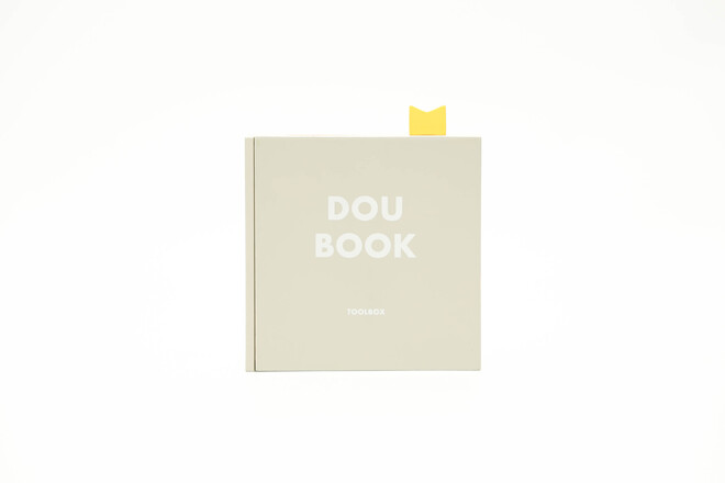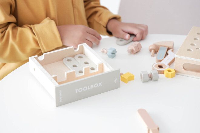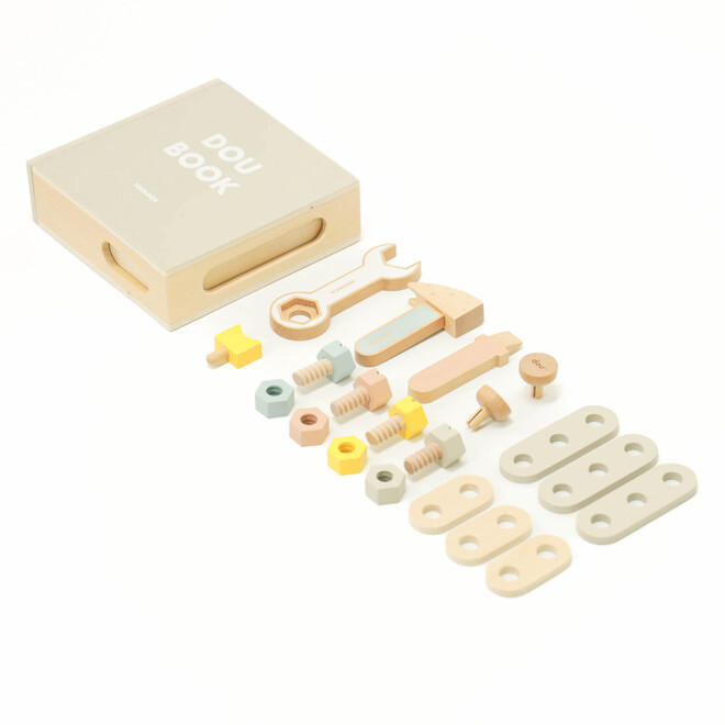 DOU BOOK TOOL BOX は、本をひらくと、大小さまざまな木製工具がずらりと並ぶ知育おもちゃ。