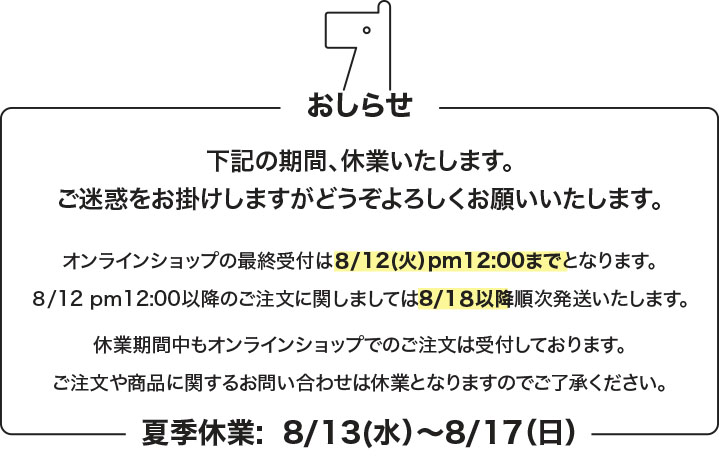 【夏季休業のお知らせ】 誠に勝手ながら、下記の期間を夏季休業とさせていただきます。 休業期間:2025年8月13日(水)〜 8月17日(日) 休業期間...
