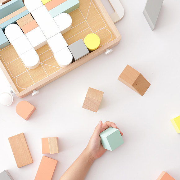 コロコロ!持ち運べるキャリーに入ったカラフルな積み木